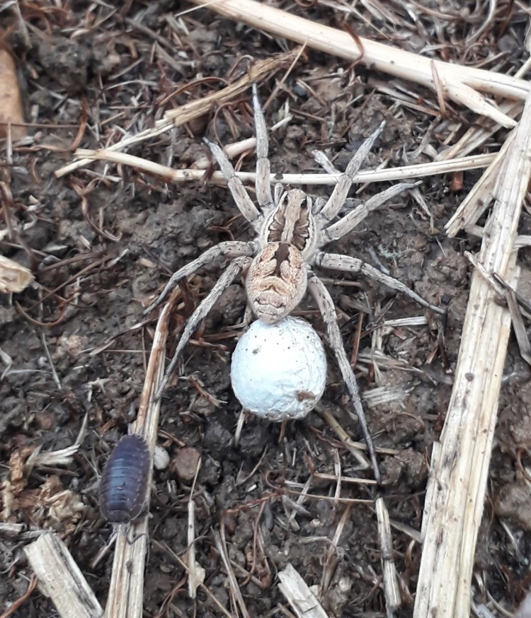 Araña-lobo con huevos acompañada de una cochinilla de la humedad